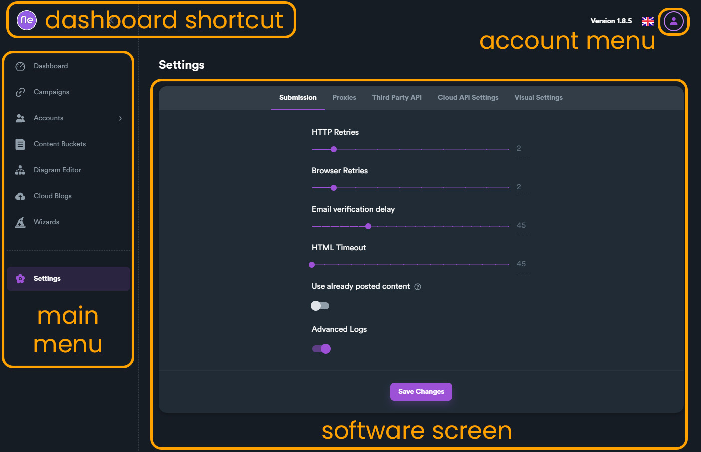 There are three different main sections on SEO Neo. The main menu where the user can navigate between software sections/screens. On the image below, main menu is located on the left section of the software. This can change from software settings. The account menu, where you can find information find important links, login/logout from your account and export Debug info to get better support. On screen center you can see software screen. This is where all the magic happens!