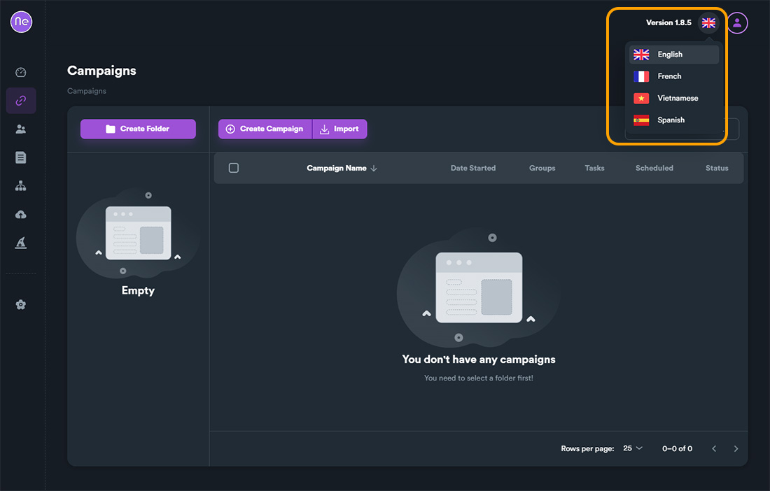 SEO Neo is a multilingual application and by default it's UI (user interface) language is in English language. Except from English, SEO Neo supports three more languages including Spanish, French and Vietnamese.
