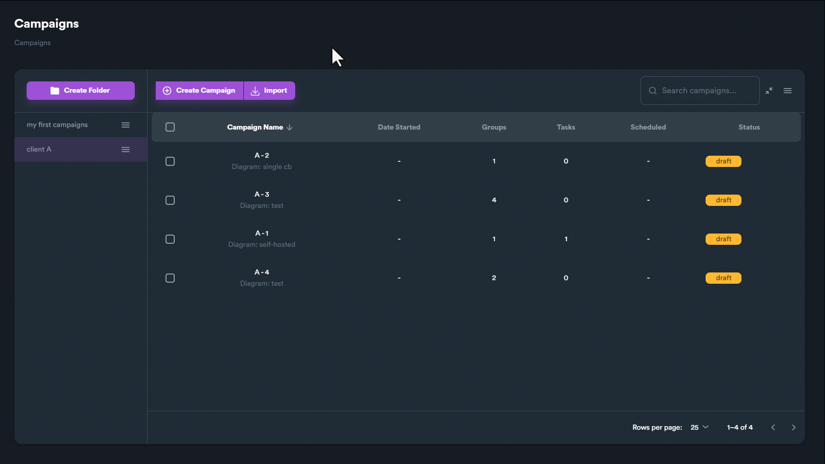 Every time you create a new campaign, the campaign will be saved within the folder that has been selected. In the next image for example, you can see that if you create a new campaign it will saved within the folder "**client A**" which is currently selected.