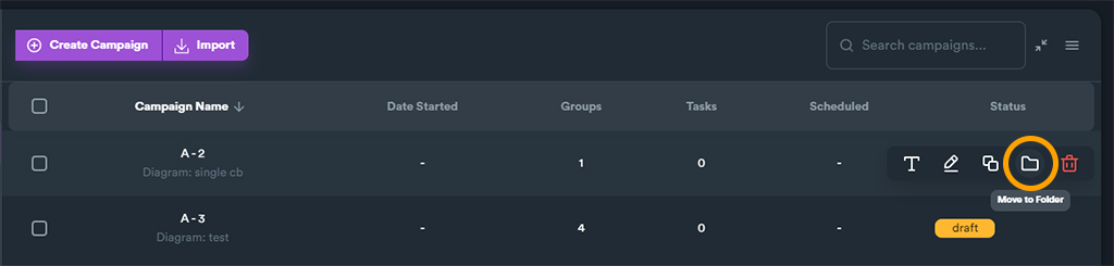 <figure><img src="https://2718133043-files.gitbook.io/~/files/v0/b/gitbook-x-prod.appspot.com/o/spaces%2F2UzeMjUGHvOZRX1jMiVc%2Fuploads%2Fvm6xRYf9w9f93HmraFWd%2F3%20-%20folder.jpg?alt=media&#x26;token=a3a5f3b1-e6b6-4b01-99f4-df345a29aa7b" alt=""><figcaption><p>Hover buttons appear when you hover (keep move over) a campaign</p></figcaption></figure>