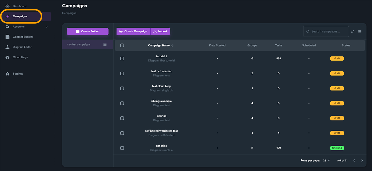 When you click on a folder you can see all campaigns within the folder along with some basic information for each campaign. Campaign information includes: