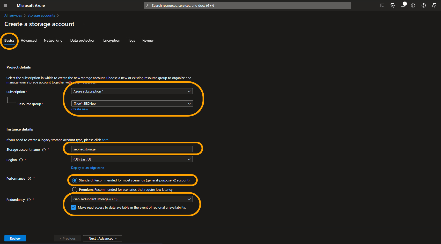 On Redundancy select "**Geo-redundant storage (GRS)**" and check the option below "**Make read access to data available in the event of regional unavailability**".