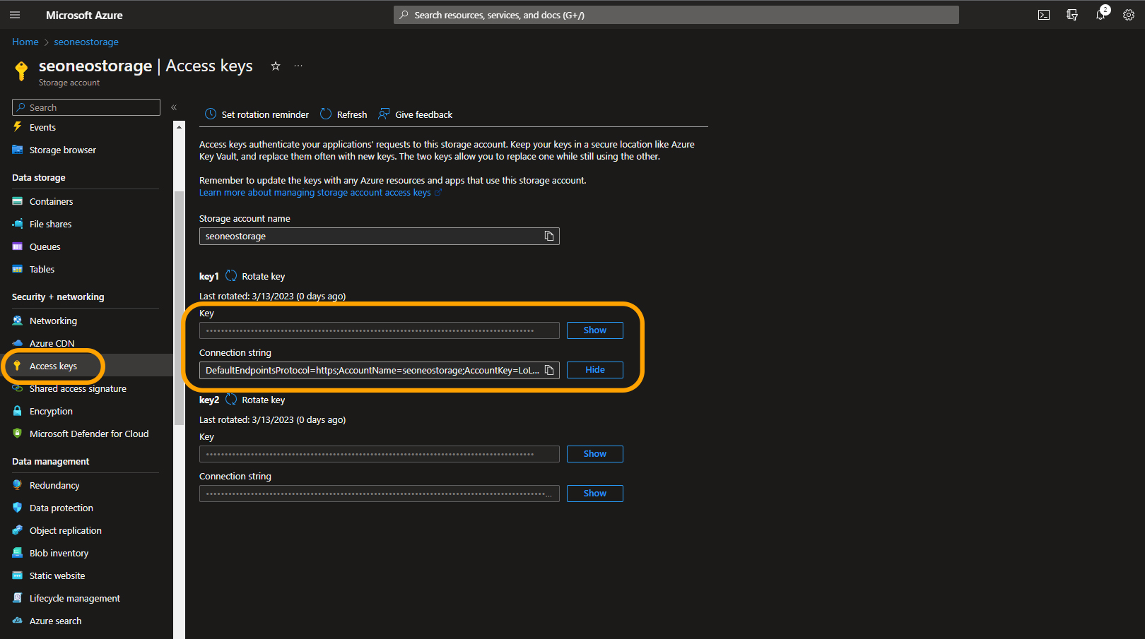 To get your credentials, from Home, open your storage (it will have the **Storage account** name you gave on the previous step).