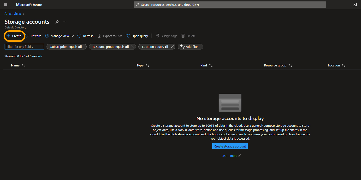 From **Storage accounts** screen, click on "**Create**", to create a new storage account.