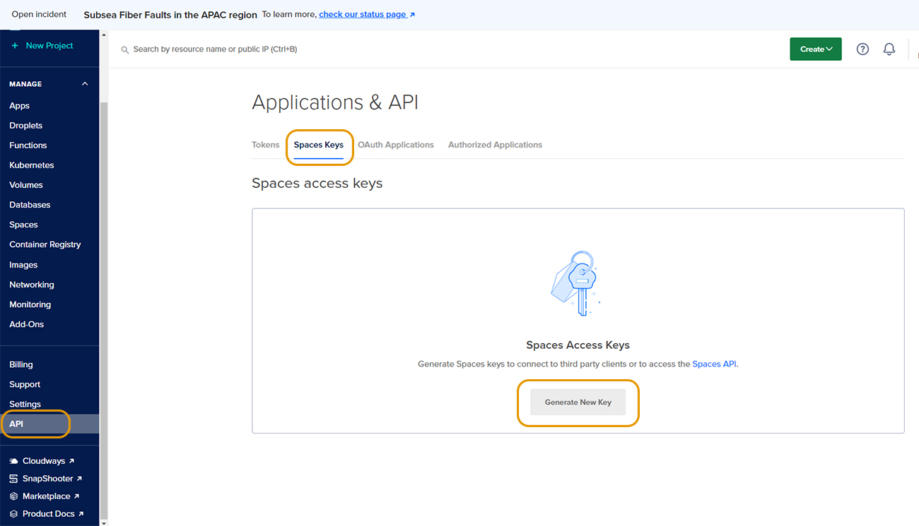 Navigate: **API** > **Spaces Keys** tab > **Generate New Key** button