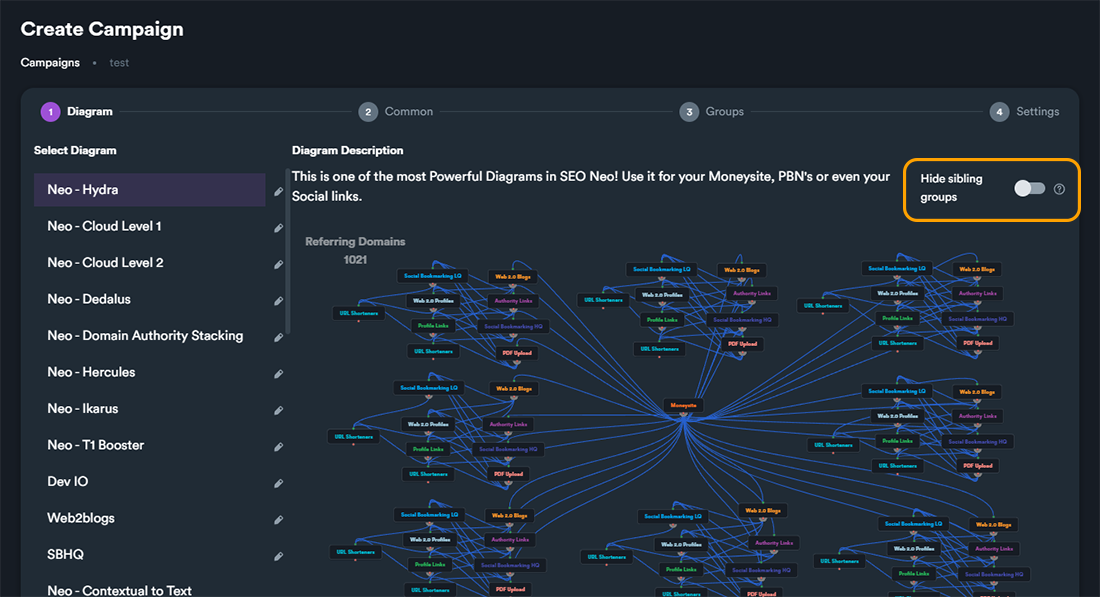 When creating your campaign using diagrams with sibling groups, you can enable "**Hide Sibling Groups**" option to make campaign creation easier. This option - when enabled - **hides sibling groups** and let user **add details for one group** while SEO Neo will use the same data for the other group.
