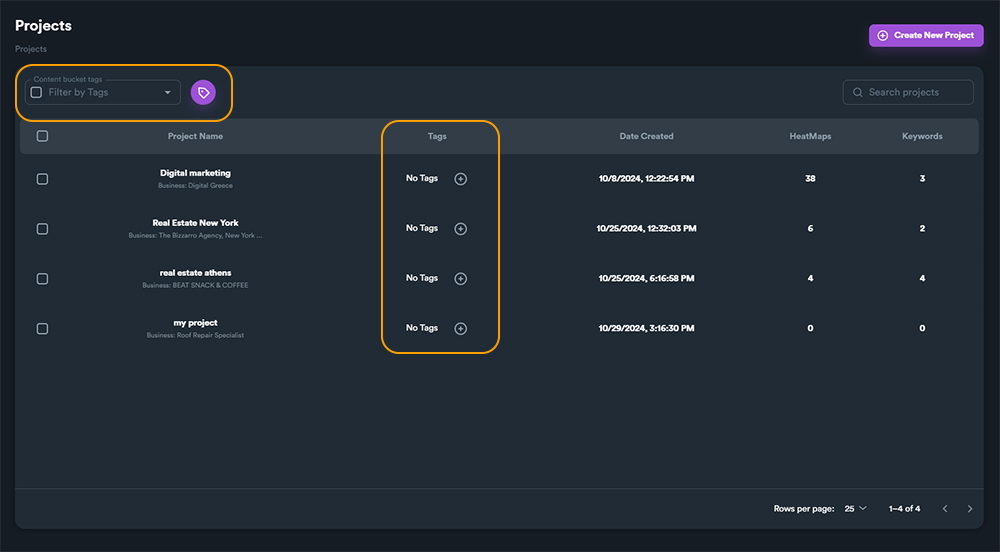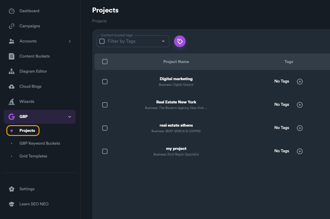 You can also use **Tags** to organize your GBP projects (as with **Content Bucket Tags**). For more information on tags, [**read this section**](https://docs.seoneo.io/documentation/content-buckets/content-bucket-tags) of the documentation.