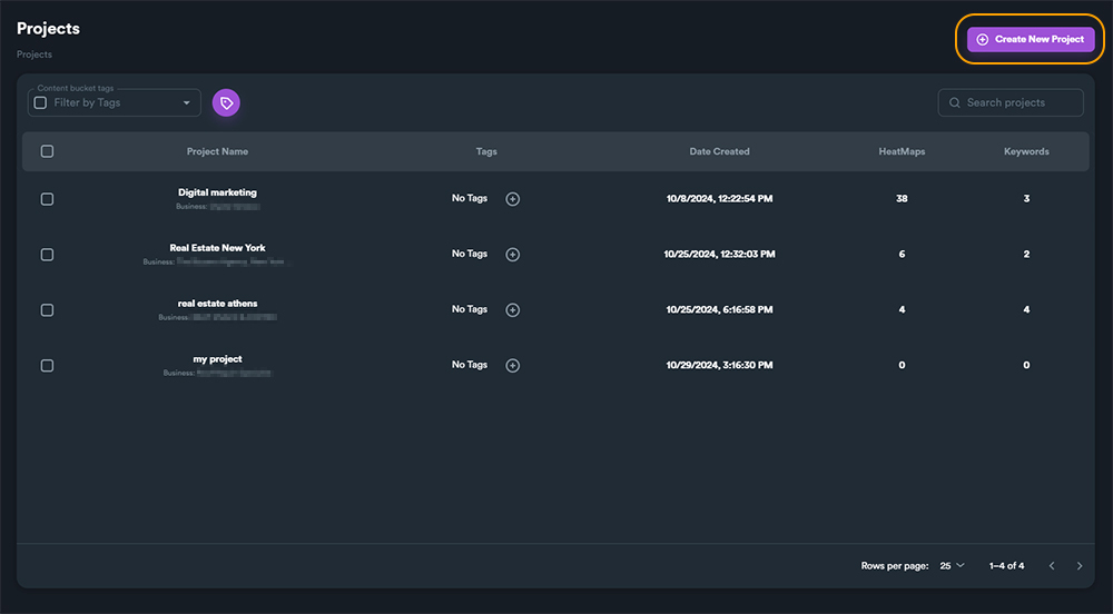 When you finish with your project details, click on "**Create project**" button. This will create a new and empty project for you. Within each project you can create different heatmaps to track your business.