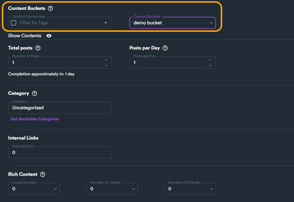 **Rich Content** sets the number of Images, Videos and Embeds you want to include in your posts. Keep in mind that you need to include rich content inside your content bucket to utilize them.