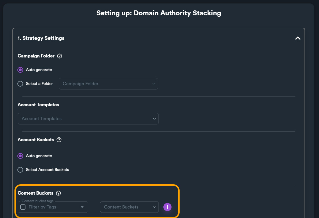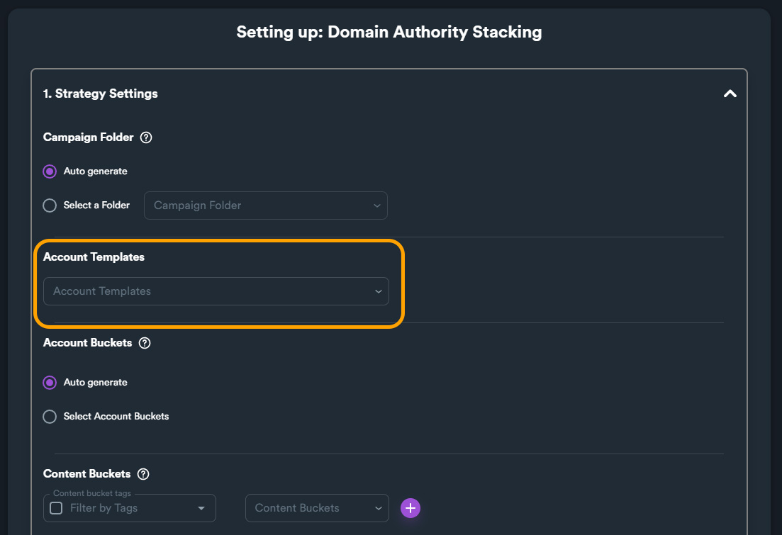 Select which account bucket you want to use. You can let SEO Neo generate an account bucket automatically (**Auto generate**) or select an existing account bucket (**Select Account Buckets**).