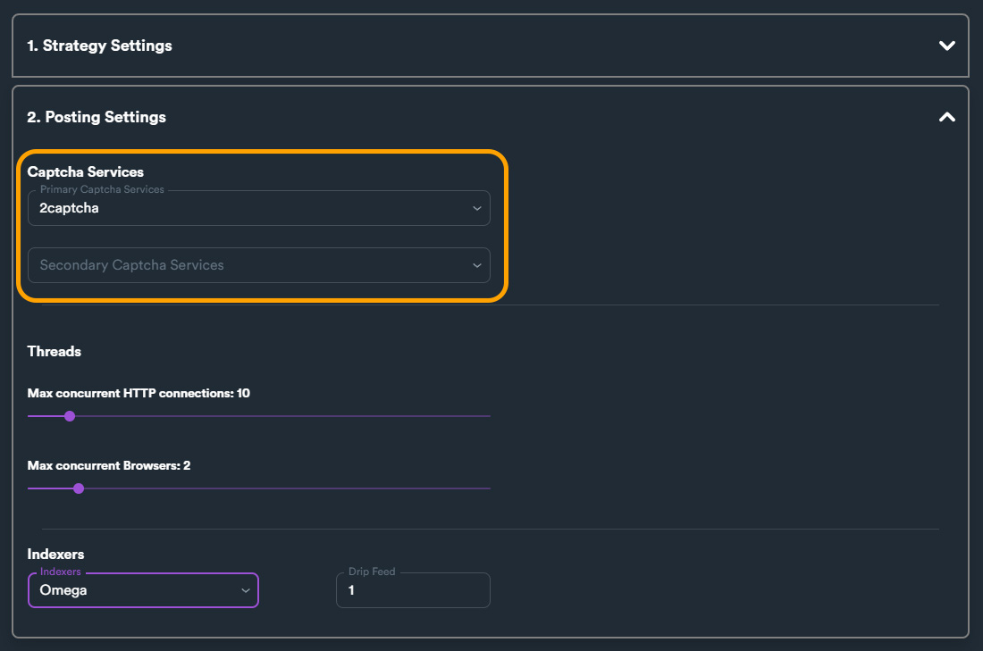 You set which captcha service you want to use for generated wizard campaign/campaigns. You can select **Primary** and **Secondary Captcha** service. The Secondary Captcha service is optional and will be used whenever the first (primary) captcha service fails to solve.