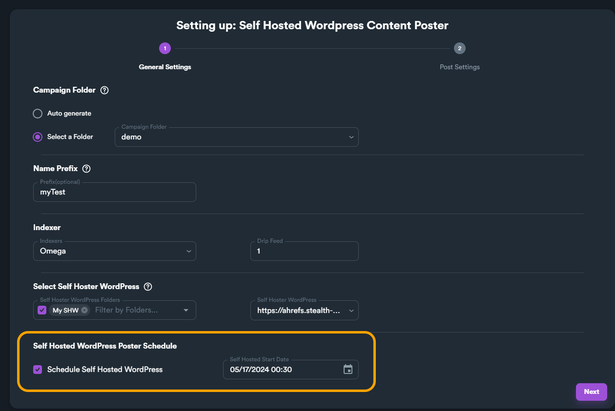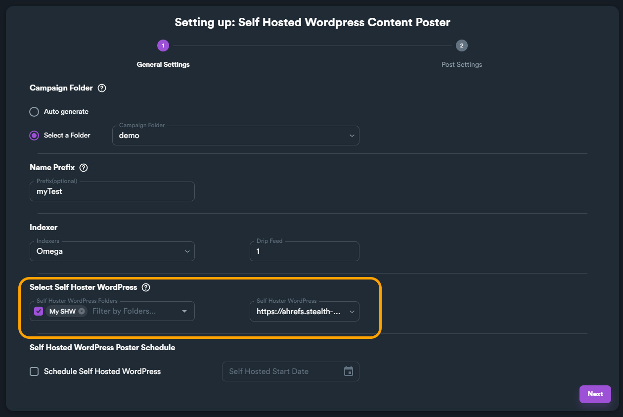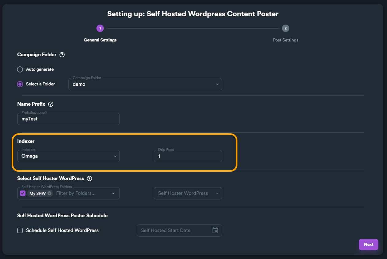 This is the same option that you can find also in other SEO Neo sections (for example when you create a new campaign). You can select an indexer to use for your Self-Hosted WordPress posts.