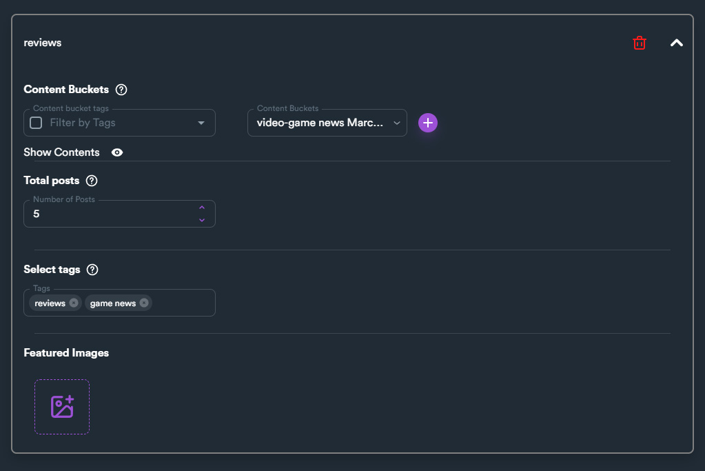 From the expanded view, you can set **content bucket**, **total** number of **posts**, **tags** and **featured images** for your posts.