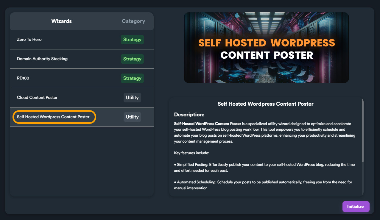 From Wizards screen select "**Self-Hosted WordPress Poster**" wizard and click on "**Initialize**" button to launch it.