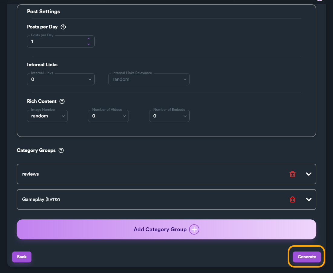 When you finish with all your category groups, click on "**Generate**" button and your are done! A new wizard campaign is created that will create all your posts based on all provided information in the Wizard.