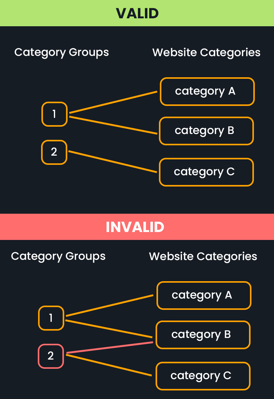 Creating a category group that posts on **A, B** and another category group that posts on **B,C** is not valid. This is because the second group includes a category (**B**) that is **already included** in first group.