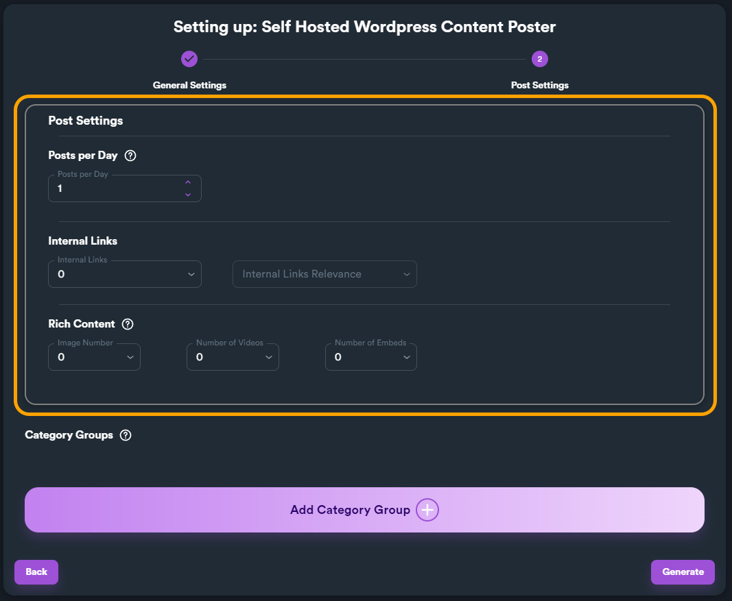 This wizard helps you create posts on your self-hosted WordPress website. To help you with this task we created category groups. A category group is a group of posts settings that apply on different categories of your WordPress website. This means that you can create different posts with different settings on different categories.