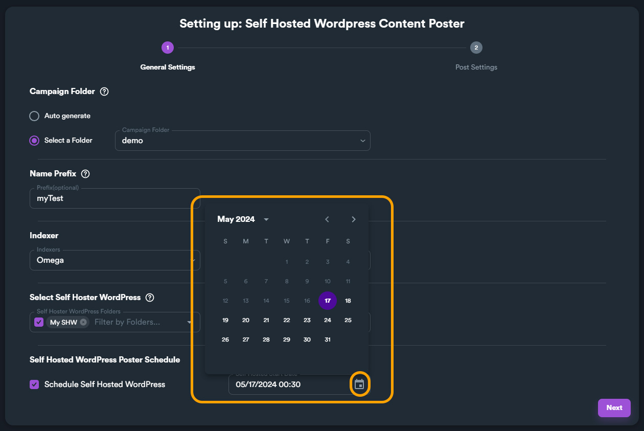 This option is optional but is very useful. You can check "**Schedule Self-Hosted WordPress Poster**" option and select a date and time (by clicking on the box on the right side).