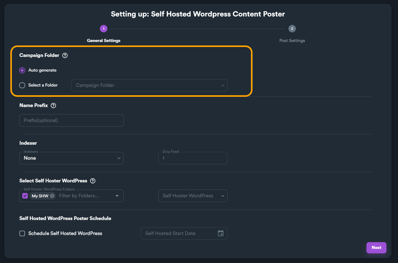 In this section you select which self-hosted WordPress you want to use to create your posts. You can filter-out your self-hosted WordPress websites by folder (using the left drop-down menu and selecting a folder).
