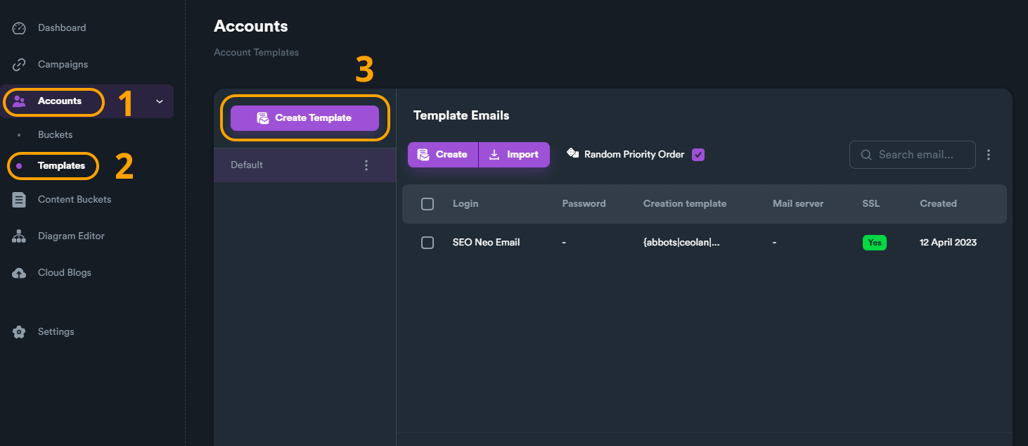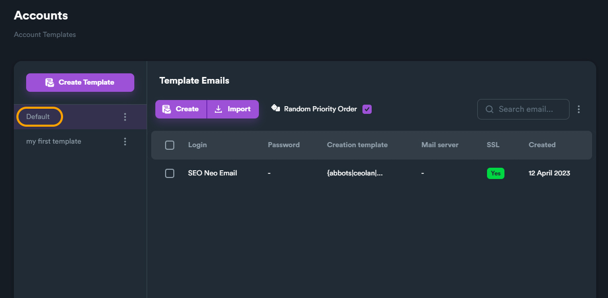 You can add as many e-mails as you want inside each account template. If you don't want to create a new account template from scratch, you can use "Default" account template. This template has only one e-mail entry which is SEO Neo Email.