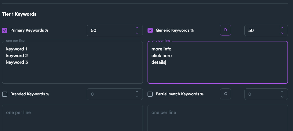 In the example above we have enabled two keyword types (Primary keywords and Generic keywords).