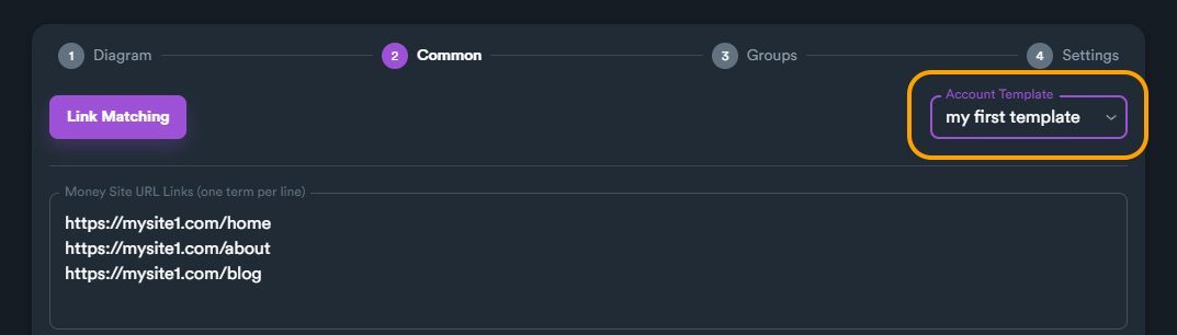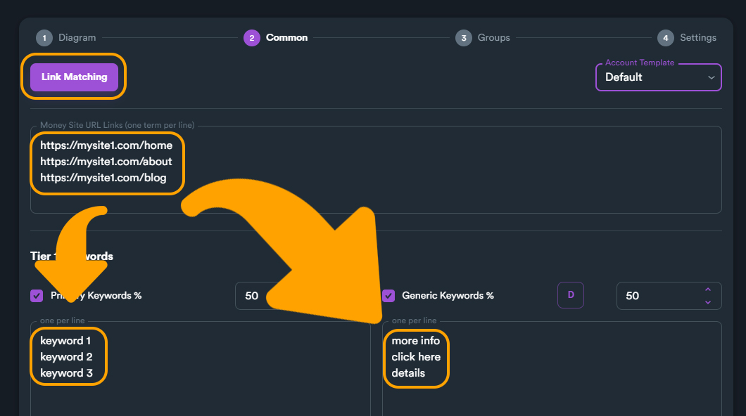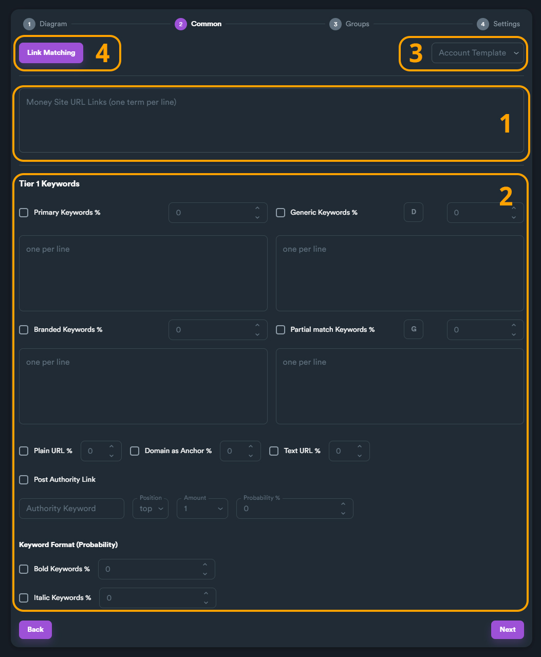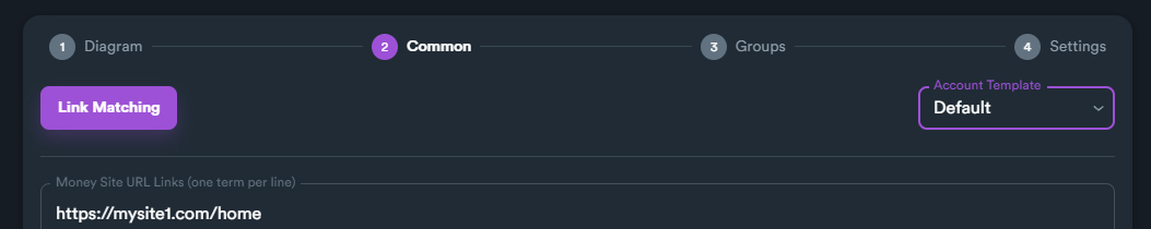 On this section you can enter your target urls (money site URLs), set all keywords, select your account template and match your keywords with URLs.