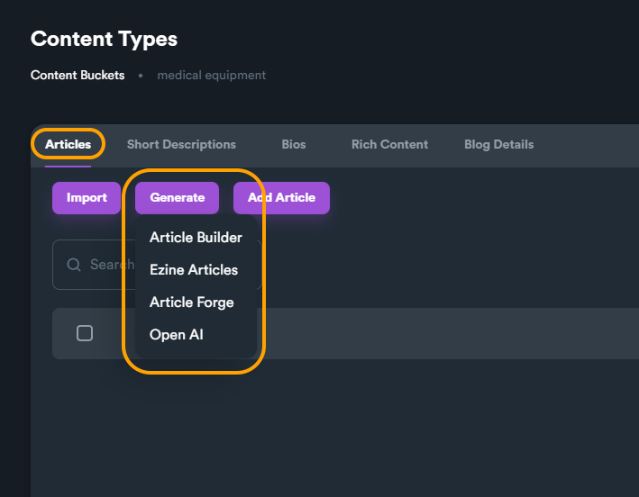 Each content type supports different content generators.  For **Articles** and **Short Descriptions** you can use all generators but on other content types you can only use Open AI or even the built-in scraper.